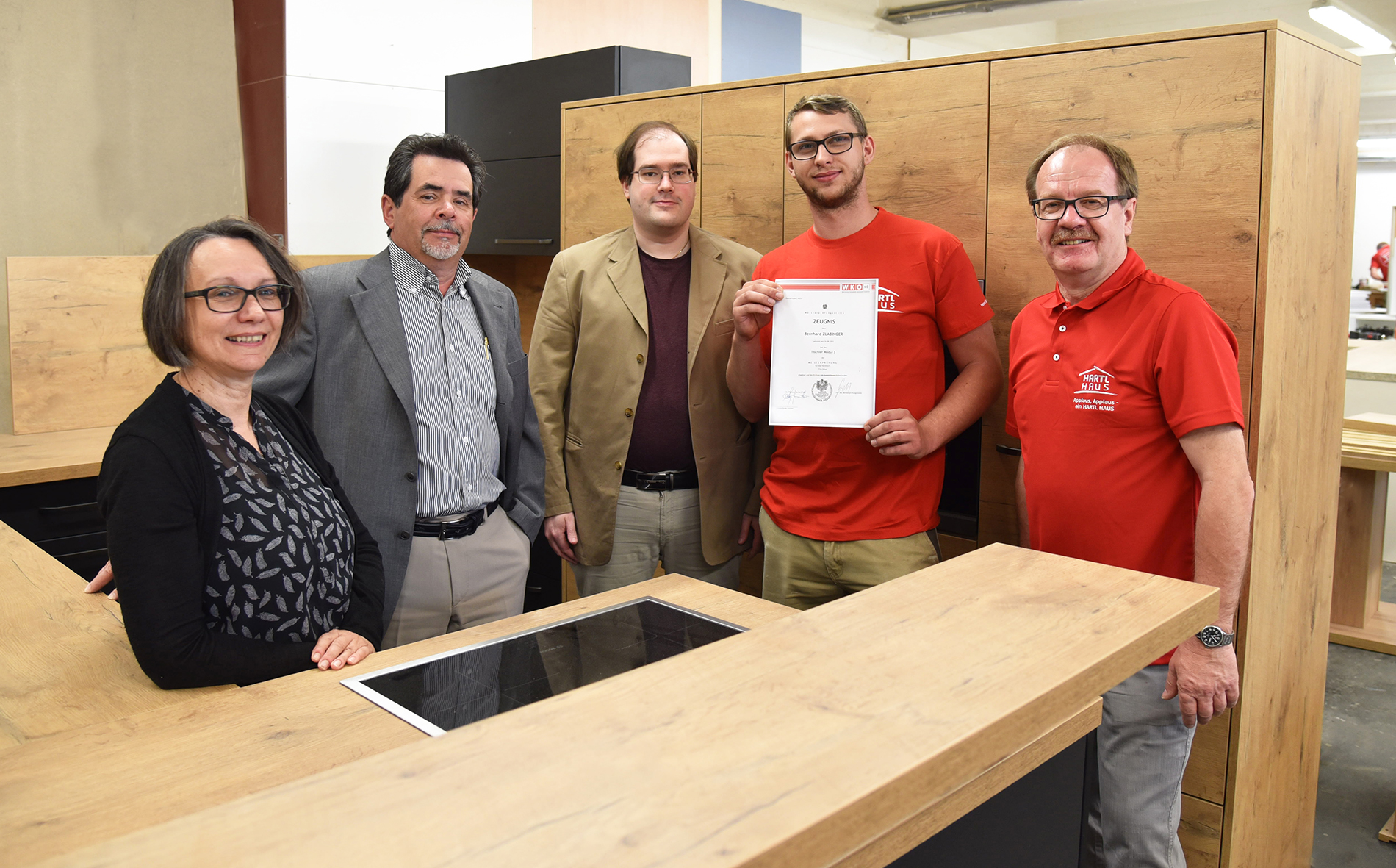 „Weiterbildung wird bei uns groß geschrieben und Karriere mit Lehre unterstützt. Ich bin stolz auf Bernhard Zlabinger, der die Herausforderung hervorragend gemeistert hat.“, zeigt sich Dir. Peter Suter stolz auf seinen Mitarbeiter in der Möbeltischlerei.